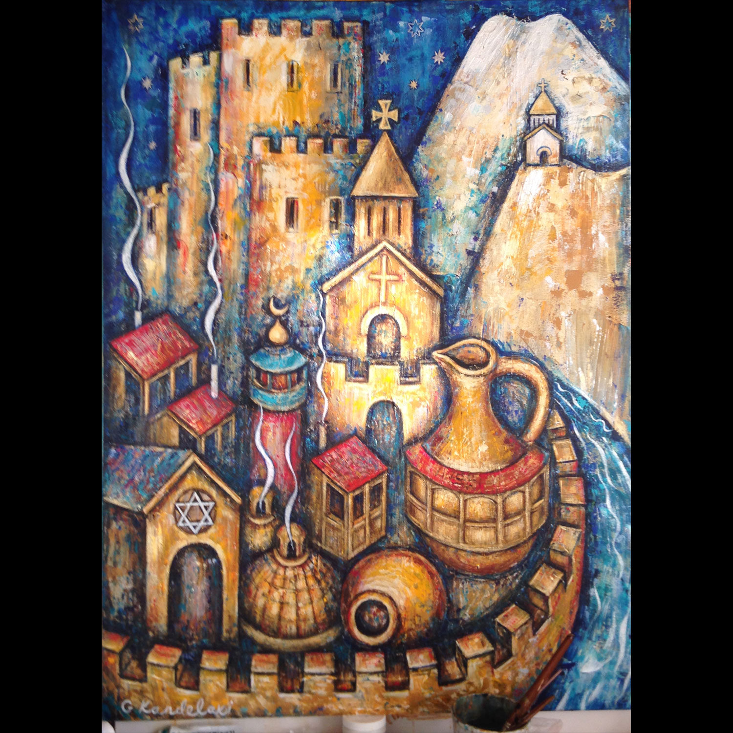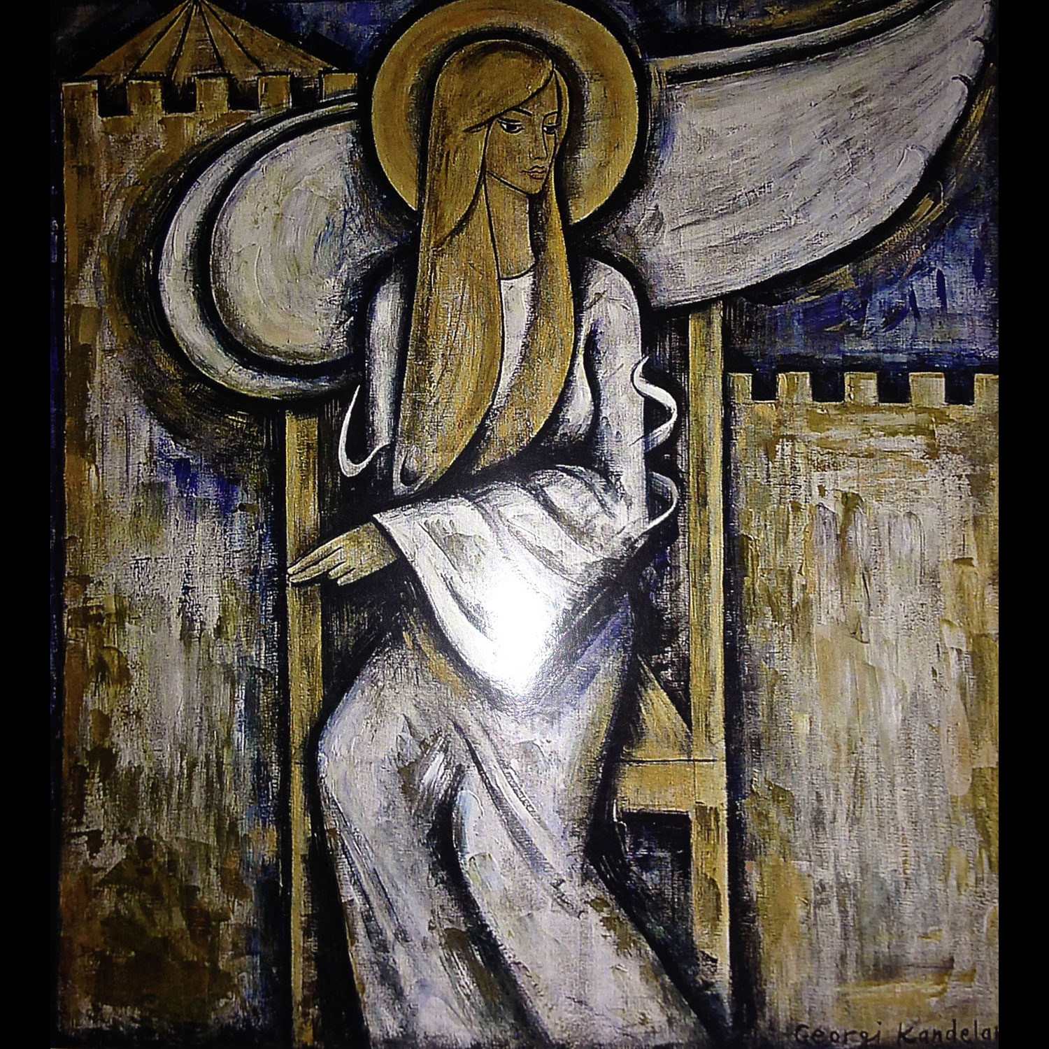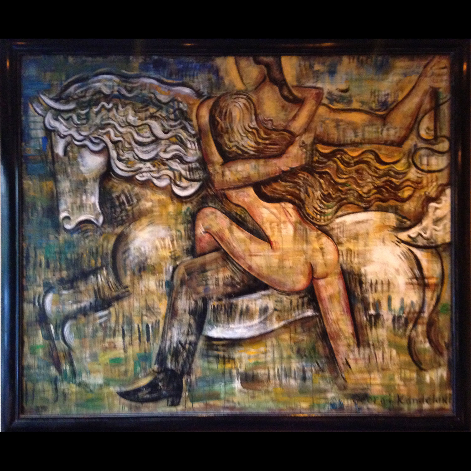 The copy-of-a-copy has become the only way to survive artistic reality. Georgi chose to find his own identity, to light his own fire as a modern observer of public life and an original artist. Kandelaki in Georgian means “candle”. Georgi’s “light” is not about cataloguing an epoch’s social types or producing chopped up political slogans in the aftermath of Georgia-Russia conflict. It does not lend itself to such meanings. A great proportion of his artistic output is concerned with self-referential visual and verbal emotional pulse of his past and present experiences between two worlds. It is an existentialist and individualist position that did not assume any explicit political form. Looking at Georgi Kandelaki’s art, one can find clear expressionist matrix with post Cubist values, mixture of abstraction and surrealism reflecting his Georgian ancestry and the whole rainbow of human emotions in the subject matter of modern life and love. His original, attuned to the changing moods personality emerges from his use of color – all shades of warm, bright palettes- a visual equivalent of himself. The fundamental theme of his paintings is centered on the female/male figures, the forms of which contorted and ravished, came to assume a dimension both tragic and grotesque.